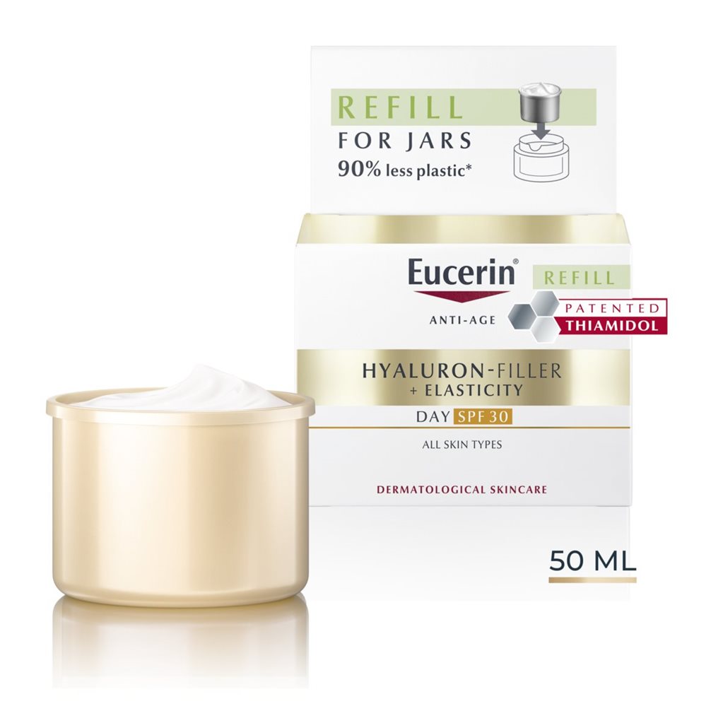 This Hyaluron-Filler +Elasticity SPF 30 Refill contains 90% less plastic compared to the regular Eucerin Face Care jar. By using this refill, you can help to reduce plastic waste and contribute towards a more sustainable product cycle. Compatible with all Eucerin Face Care jars.