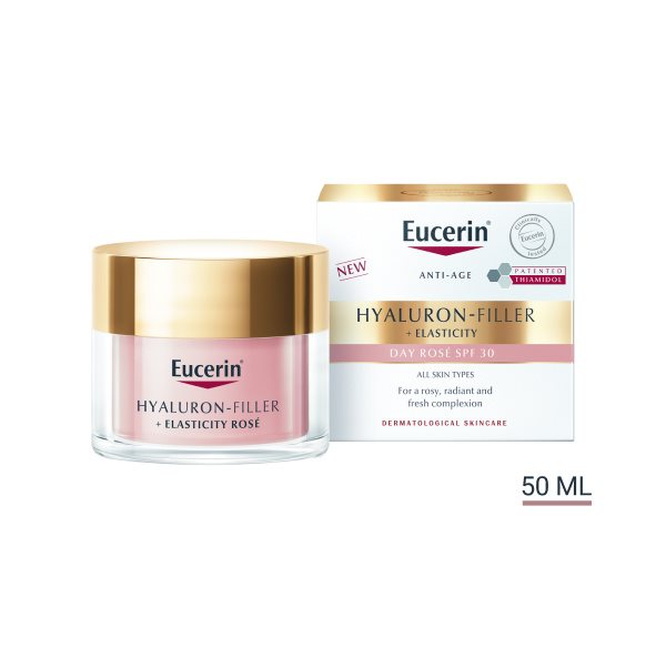 Eucerin Hyaluron-Filler + Elasticity Day Rosé SPF 30 is an anti-ageing day cream that provides an instant rosy glow to counteract pale skin, plump up deep wrinkles, improve the skin’s elasticity, correct age spots, and instantly restores radiance.