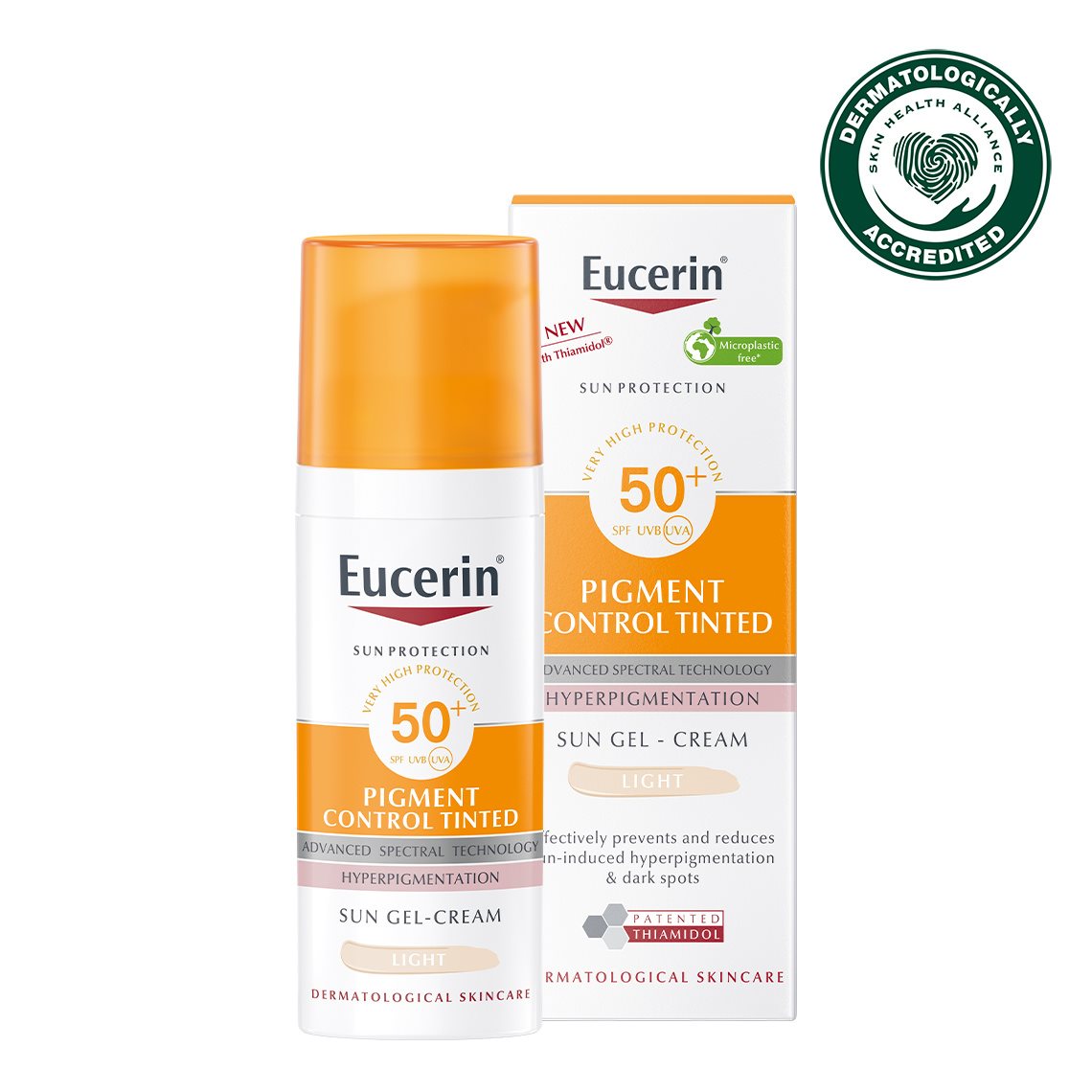 UV light is the main cause of sun-induced skin damage, but high-energy visible (HEVIS) light can also induce free radicals that cause further stress to skin. Sunlight triggers an increase in melanin production which may lead to hyperpigmentation concerns such as sun spots. Eucerin Sun Pigment Control Tinted Light SPF50+ is an everyday facial sunscreen for all skin types that helps to prevent sun-induced hyperpigmentation. The Advanced Spectral Technology combines broadband and photostable UVA/UVB filters(1) for very high UV protection with Licochalcone A to neutralise free radicals caused by UV and HEVIS light. The anti-pigment sunscreen also includes Glycyrrhetinic Acid which supports skin’s own DNA repair mechanism. The colour pigments included display a light tint and achieve a dual effect